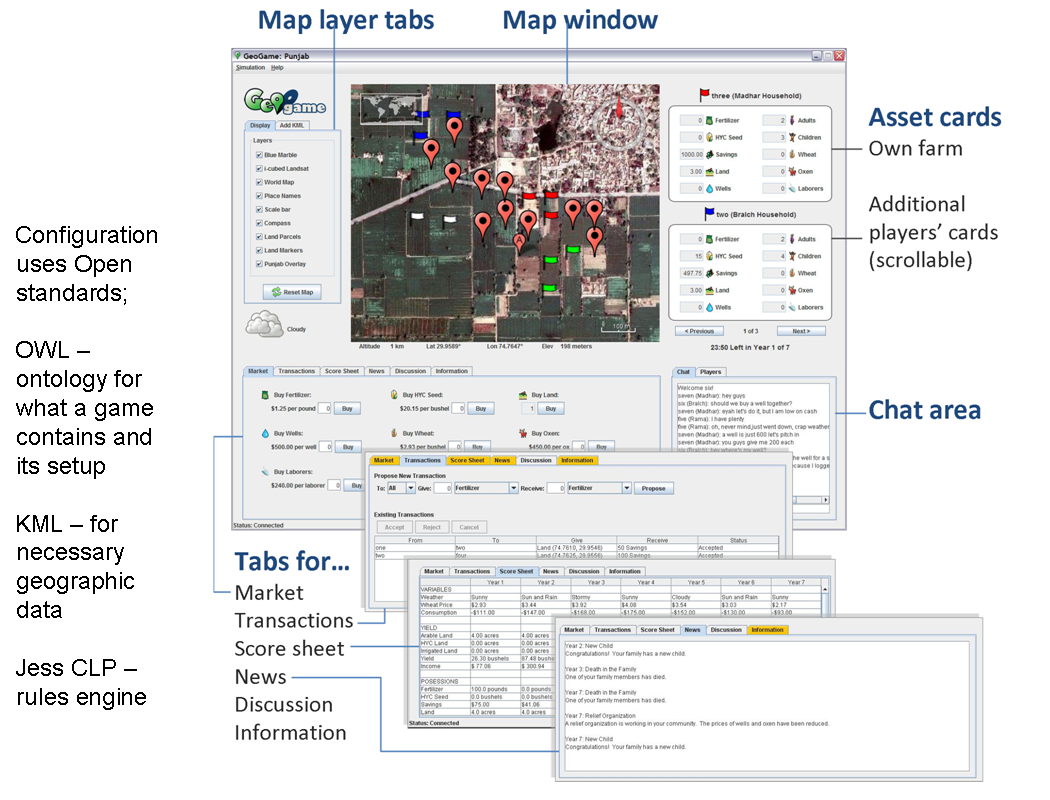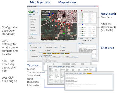 Now, this might not look like much but we think it is a significant step towards creating a development platform for massive multi-player online geographic games (oh dear, that will be MMOGG). The thing that we are most proud of here is that we have separated the interface from the assets and rules so that it becomes more modular and easier to change the parameters of the game. So, an external onotlogy file (in OWL) contains all the information about what a game contains, how many players it can take, which geographic data to load, and which rules to use. Essentially that ontology defines what exist in the game. Another separate Jess (that's the Java Expert System Shell) CLP file has all the rules for the game. So we can modify e.g how yield is calculated without having to modify the program code. Finally, the game is situated based on a KML file (that' your typical Google Earth geodata format) that contains the farmland areas where the game is going to be played. This makes it possible to move the game from being played in Punjab, India to Marion, Ohio if you want. Obviously we did not have the time to code a game configuration interface or manual, so these kind of tweaks are a bit undocumented and hidden, but they work!